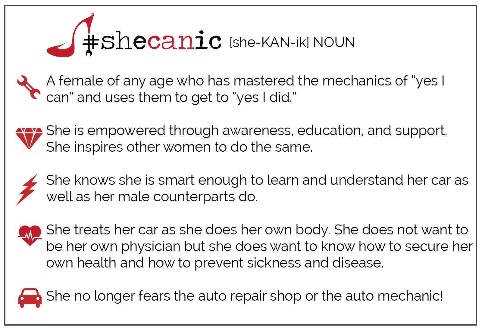 The sheCANic movement is a growing community of CAR-SAVVY women. Join Us!